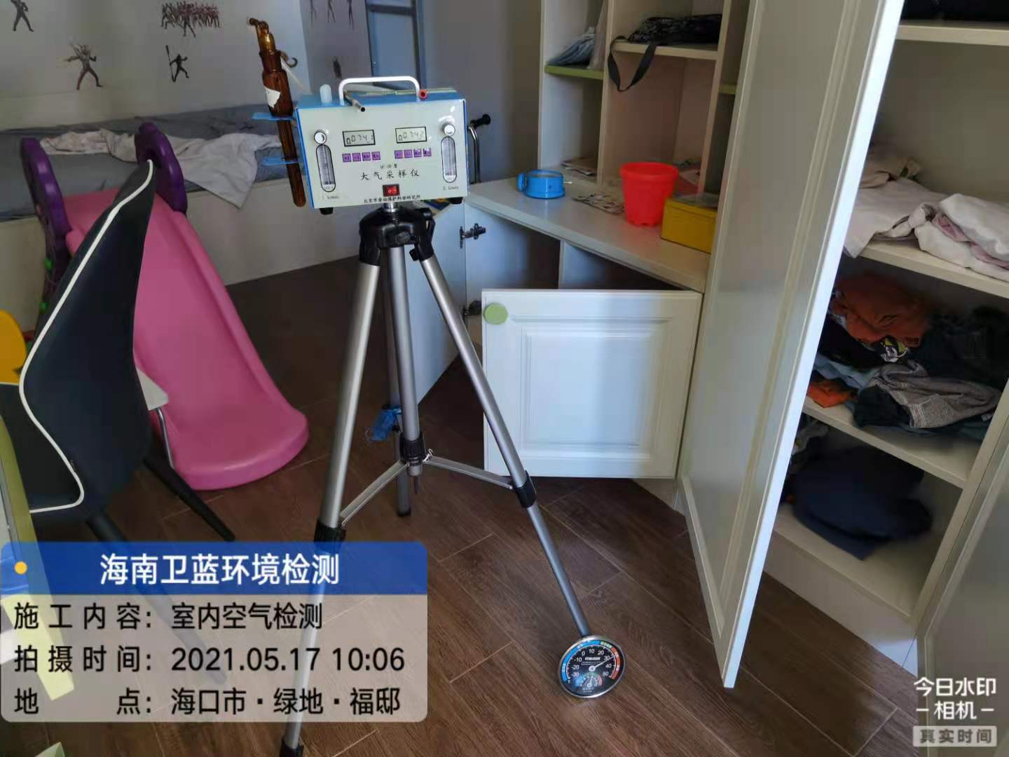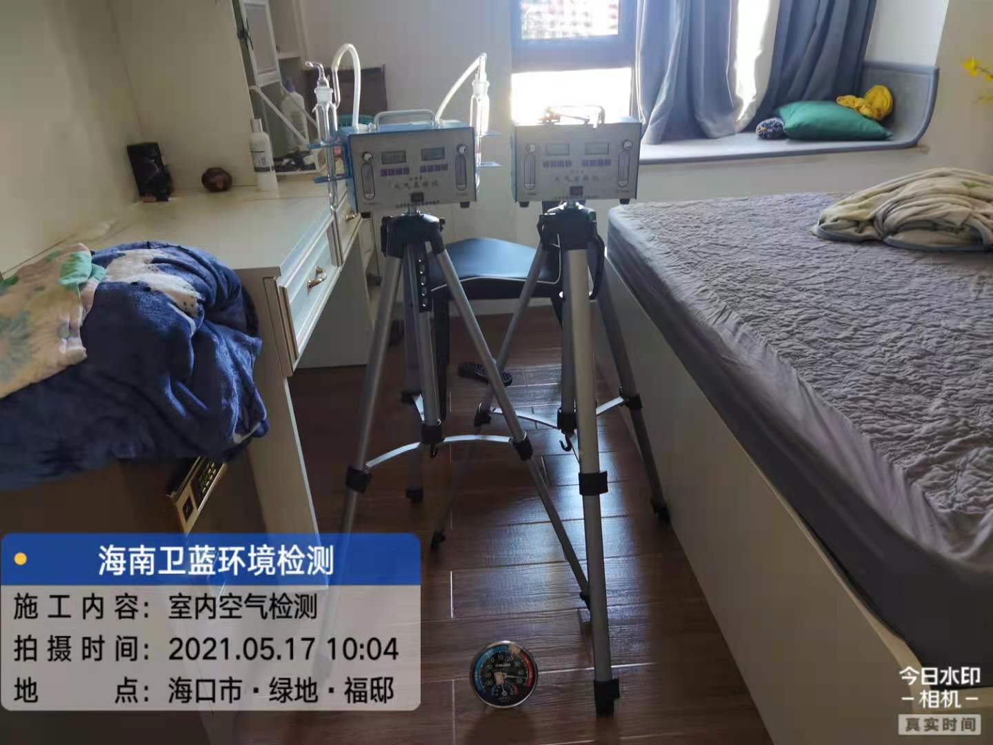 按照預(yù)定時(shí)間,衛(wèi)藍(lán)環(huán)境檢測上門采樣人員于五月十七日上午十時(shí)許到達(dá)??谑行阌^(qū)長濱西一街綠地福邸,進(jìn)行室內(nèi)空氣檢測的甲醛采樣工作。業(yè)主按照GB/T 18883-2002《室內(nèi)空氣質(zhì)量標(biāo)準(zhǔn)》要求,在采樣前對每個需要采樣的房間進(jìn)行單獨(dú)密閉,累積密閉時(shí)長12小時(shí),現(xiàn)場室內(nèi)溫度30°C左右,經(jīng)現(xiàn)場勘察環(huán)境適合采樣,采樣人員現(xiàn)場組裝儀器,穿上鞋套,進(jìn)行采樣作業(yè)。