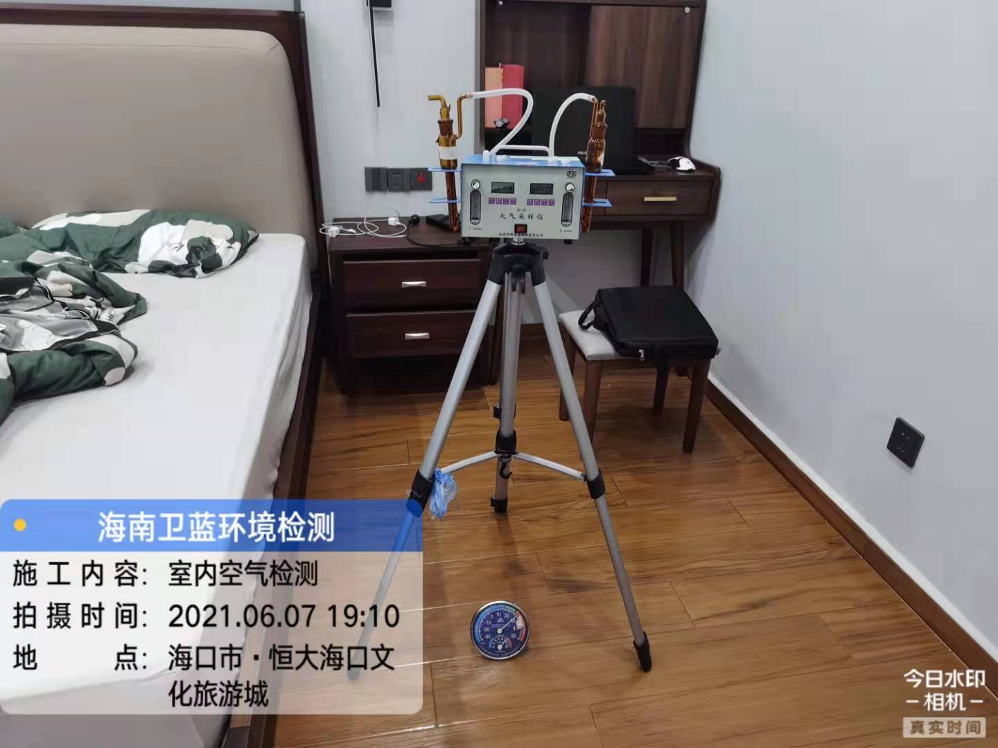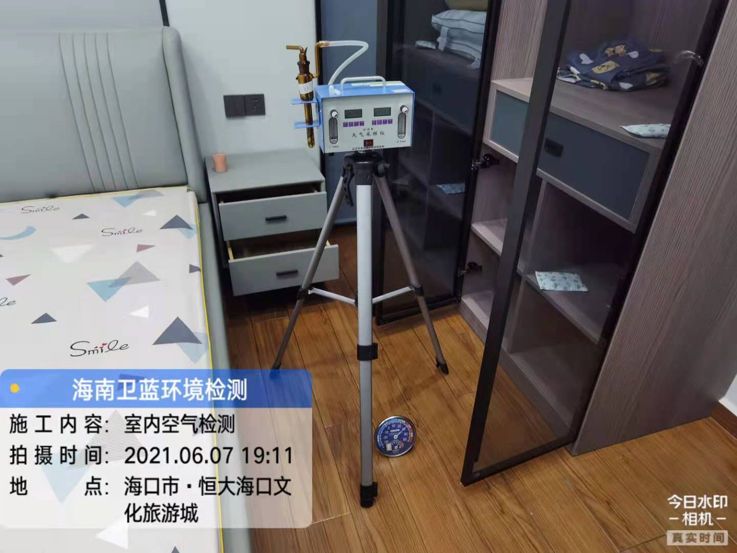 按照預(yù)定時(shí)間,衛(wèi)藍(lán)環(huán)境檢測(cè)上門(mén)采樣人員于六月七日上午十九時(shí)許到達(dá)??谑旋埲A區(qū)迎賓大道88號(hào)恒大??谖幕糜纬?,進(jìn)行室內(nèi)空氣檢測(cè)的甲醛采樣工作。業(yè)主按照GB/T 18883-2002《室內(nèi)空氣質(zhì)量標(biāo)準(zhǔn)》要求,在采樣前對(duì)每個(gè)需要采樣的房間進(jìn)行單獨(dú)密閉,累積密閉時(shí)長(zhǎng)12小時(shí),現(xiàn)場(chǎng)室內(nèi)溫度27°C左右,經(jīng)現(xiàn)場(chǎng)勘察環(huán)境適合采樣,采樣人員現(xiàn)場(chǎng)組裝儀器,穿上鞋套,進(jìn)行采樣作業(yè)。