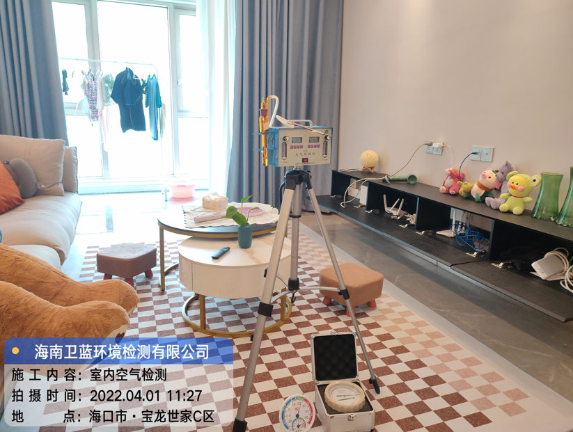 按照預(yù)定時(shí)間,衛(wèi)藍(lán)環(huán)境檢測(cè)上門采樣人員于四月一日上午十一時(shí)許到達(dá)海口市寶龍世家,進(jìn)行室內(nèi)空氣檢測(cè)的甲醛采樣工作。業(yè)主按照GB/T 18883-2002《室內(nèi)空氣質(zhì)量標(biāo)準(zhǔn)》要求,在采樣前對(duì)每個(gè)需要采樣的房間進(jìn)行單獨(dú)密閉,累積密閉時(shí)長(zhǎng)12小時(shí),現(xiàn)場(chǎng)室內(nèi)溫度25.0°C左右,經(jīng)現(xiàn)場(chǎng)勘察環(huán)境適合采樣,采樣人員現(xiàn)場(chǎng)組裝儀器,穿上鞋套,進(jìn)行采樣作業(yè)。