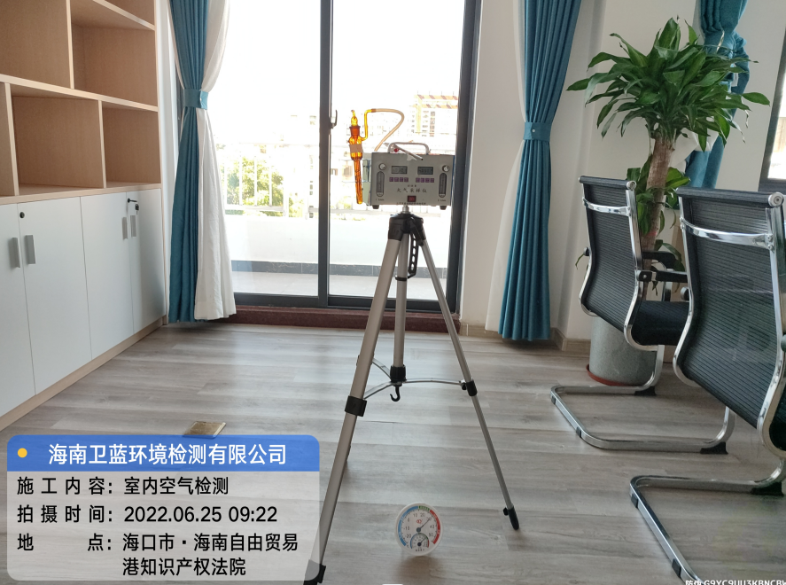 按照約定時間,衛(wèi)藍環(huán)境檢測上門采樣人員于準時到達海南貿易港知識產權法院,進行室內空氣檢測的甲醛采樣工作。單位按GB/T 18883-2002《室內空氣質量標準》要求,在采樣前對每個需要采樣的房間進行單獨密閉,累積密閉時長12小時,室內溫度30度,經現(xiàn)場勘察環(huán)境適合采樣,采樣人員現(xiàn)場組裝儀器,穿上鞋套,進行采樣作業(yè),本次采樣共計600平。