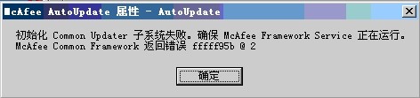 作為一名忠實(shí)的麥粉,多年來我一直使用McAfee這款殺毒軟件。但近一周開始McAfee出現(xiàn)無法更新的狀況,自動更新和手動更新都失敗,彈出錯誤提示窗口的信息為“初始化Common Updater子系統(tǒng)失敗.確保McAfee Framework service正在運(yùn)行.McAfee Framework service返回錯誤 ffffffdf @ 3”。
